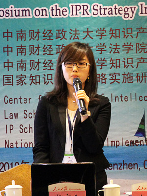 唐昭红副教授认为,黄庆司长从国家知识产权战略的高度对2011年工作进行总结和对2012年计划进行报告,为学院体系提供了一个新的研究导向。而卢文祥教授的发言则提供了一个新的视角,亦是我国知识产权的薄弱环节,即知识产权价值如何转换的问题。对Ann Bartow教授的发言,她也有同样的疑问,为什么广告中有那么多明星和美女。如果我们的文化软实力要发展,那广告策略也要发展。由于战略布局跟市场联系紧密,不好做轻易回答。