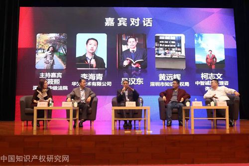在吴汉东教授的专题演讲结束后,深圳市中级法院知识产权庭审判长蒋筱熙、深圳市知识产权局黄远辉、中智诚勤管理咨询公司柯志文、华为技术有限公司专利运营负责人李海青与吴汉东教授就知识产权的运营话题进行了面对面的对话。此外,现场听众也纷纷提出了疑问与吴汉东教授进行了互动。