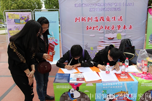 为普及知识产权重要常识,展示知识产权发展前景,提高全民的知识产权保护意识,2017年4月27日,中心知识产权研究社联合湖北省版权保护中心,在中南财经政法大学南湖校区五羊广场,共同举办“世界知识产权日·知识产权宣传周”活动。本次活动主题以“创新创造改变生活,知识产权竞争未来”,及时响应第17个“世界知识产权日”的宣传活动盛举与“国家创新驱动发展战略”的盛况。