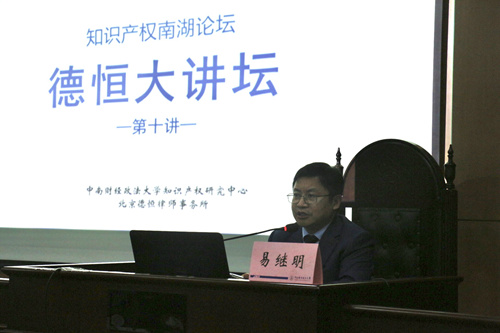 10月26日晚,知识产权南湖论坛德恒大讲坛邀请北京大学国际知识产权研究中心主任、北京大学法学院易继明教授做客,在中南财经政法大学文泰楼一楼模拟法庭(二)举办讲座。此次易继明教授回母校,以“中美关系背景下的知识产权强国建设”为题作主题报告。