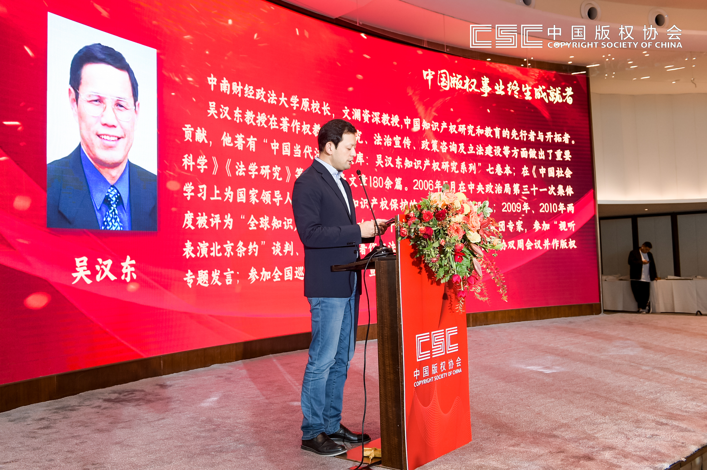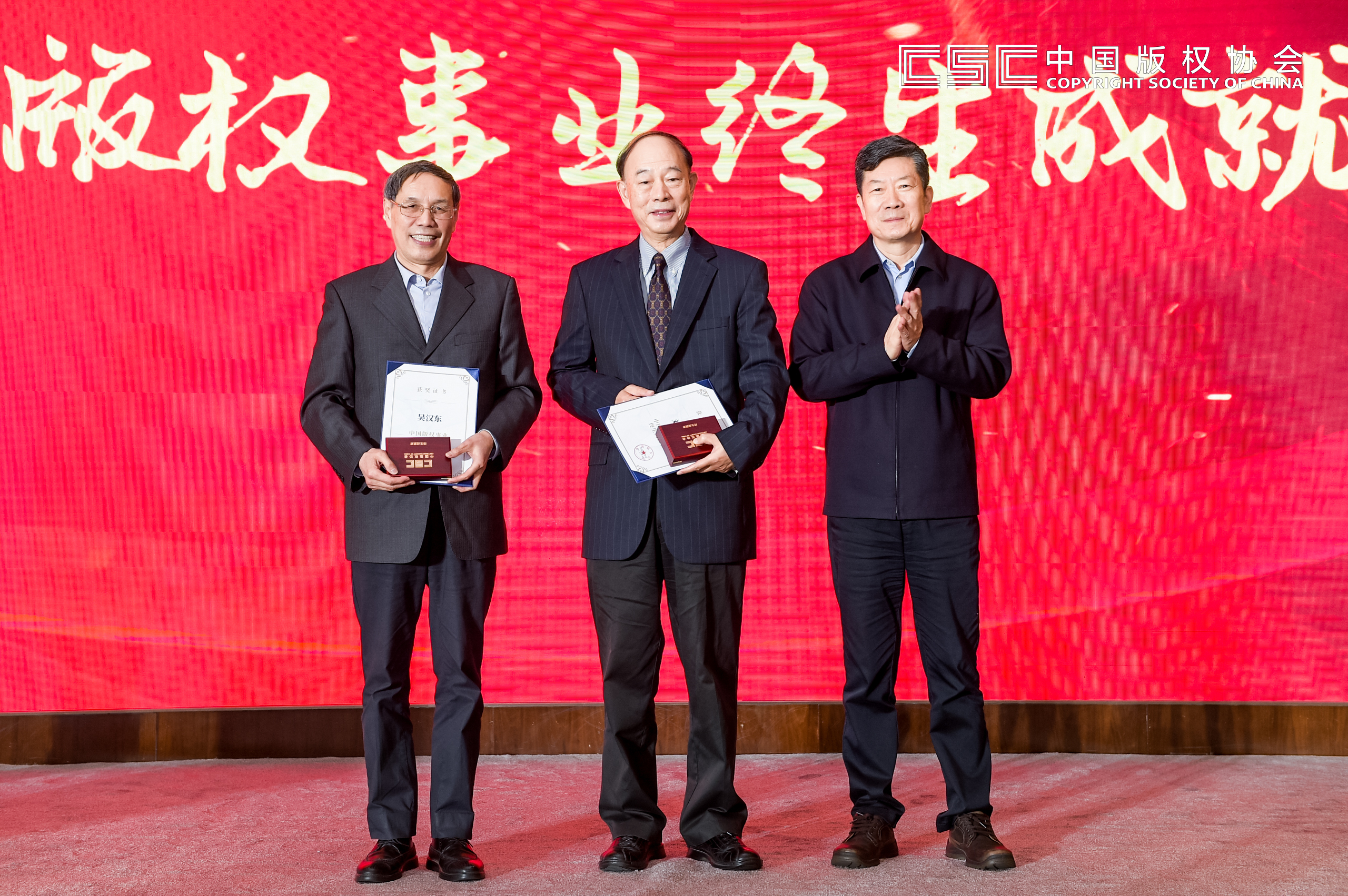 在2020年中国版权年会上,全国政协文化文史和学习委员会副主任、中国版权协会理事长阎晓宏向获评“中国版权事业终生成就者”的两位著作权领域知名学者吴汉东、刘春田颁发荣誉证书。会上还颁发了由中国版权协会评选的多个奖项,以表彰和弘扬版权从业人员和单位的开拓创新精神、艰苦奋斗历程和成功经验。